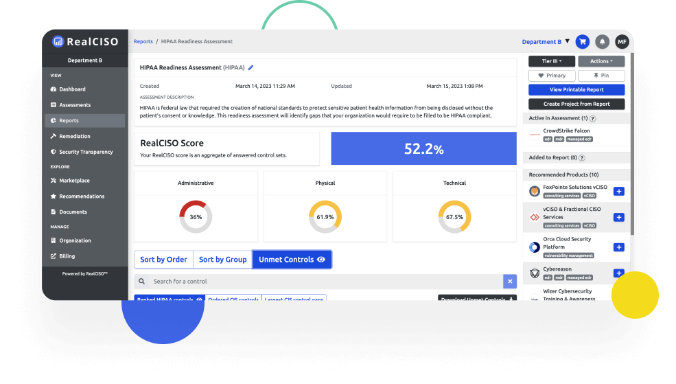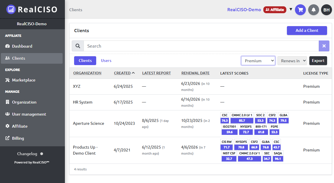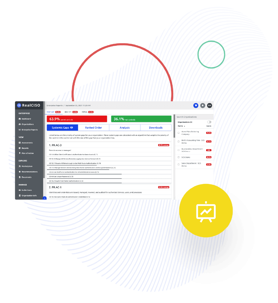 RealCISO gives you everything you need to assess against any standard, deliver actionable reports, track remediation, showcase progress, and even prepare clients for cyber insurance — all in one platform that you can white-label and make your own.
